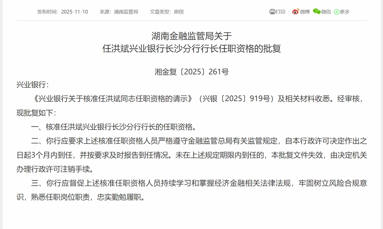 11月10日配资优秀股票配资平台,湖南金融监管局发布关于任洪斌兴业银行长沙分行行长任职资格的批复,核准任洪斌兴业银行长沙分行行长的任职资格。